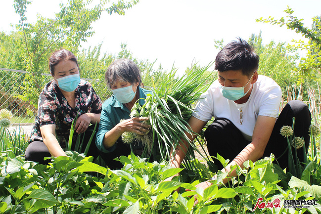6月2日,党员助农服务队队员帮助村民打理庭院内种植的蔬菜。阿克苏地区库车市林业草原局驻塔里木乡胡杨社区“访惠聚”工作队成立了党员助农服务队,帮助村民解决生产生活中的困难。(摄影:尼亚孜·热合曼)