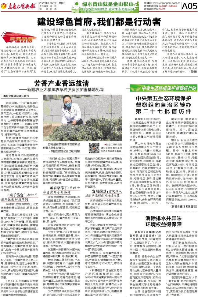 这给苏秀娟团队的研究注入新动力。20年来,团队先后完成构建新疆薰衣草种质资源的分子指纹图谱数据库、选育两个薰衣草新品种等多项科研攻关项目,为薰衣草品种的精准鉴定提供技术支持,也为薰衣草精油产量提高及用途开发提供物质基础,有效促进新疆薰衣草特色经济产业快速发展,让芳香产业香远益清。