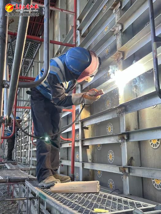 在乌鲁木齐机场改扩建工程, 中建新疆建工四建工人李艳强左手拿着电焊面罩、右手握焊枪,正对石材幕墙横龙骨进行焊接。