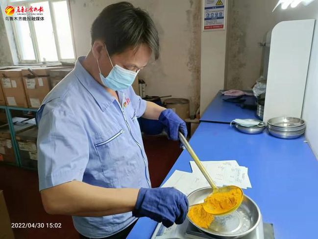 在新疆天山纺织服装有限公司毛纺厂染色车间,47岁的杨立刚调配新订单所需的颜色。