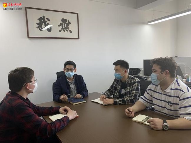 自治区劳动模范、新疆申新科技合作基地有限公司总经理沙超伦(左二)在初创企业,研究探讨今年业务转型及投后服务相关事宜。