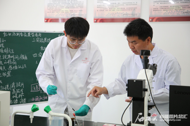 5月18日,在新疆振兴园牧业有限责任公司,阿克苏职业技术学院2022届毕业生图尔荪古丽·托合提正在药剂室做试验。古丽巴哈尔·艾海提摄