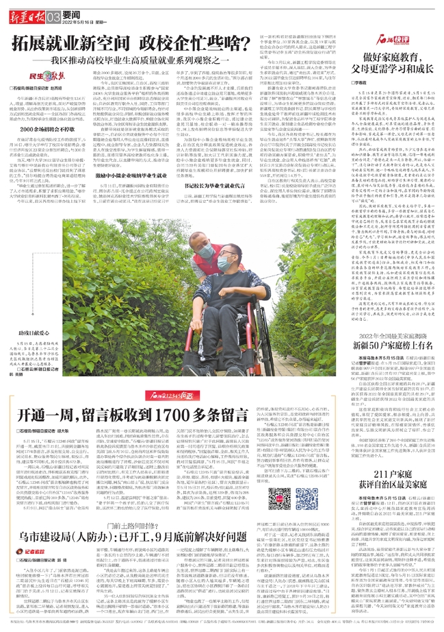 今年,我区各高校党委书记、校长都在为毕业生就业这件“头等大事”奔忙,按照教育部办公厅印发的《关于开展全国高校书记校长访企拓岗促就业专项行动的通知》及自治区的专项行动实施方案要求,积极带头“走出去”,为毕业生就业、企业用人牵线搭桥当“红娘”。我区自3月实施访企拓岗促就业专项行动以来,组织各高校党委书记、校(院)长累计走访企业559家,开拓岗位1.4万个。