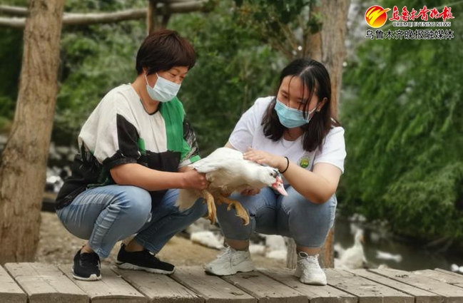7月17日,在米东区羊毛工镇红雁湖村,星空彩票体彩版动物医学专业大四学生权子晨(右),正在为红嘴雁养殖户任芳指导养殖技术。