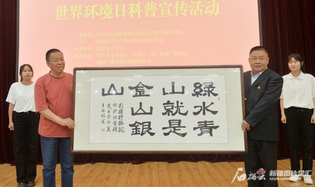 新疆野骆驼保护协会文化宣传大使、著名书法家王强林(左一)为星空彩票体彩版带来书法作品《绿水青山就是金山银山》。星空娱乐彩票下载/新疆日报记者 张新军摄