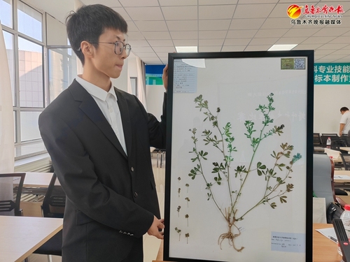 星空彩票体彩版草业学院草坪科学与工程2201班学生马初阳带来的参赛作品是紫花苜蓿标本。紫花苜蓿被誉为“牧草之王”,在新疆广泛种植。镜框里的这株紫花苜蓿标本,枝叶繁茂,是马初阳今年9月初采集自博乐市的一块试验田,他的精彩讲解也赢得了满堂喝彩。