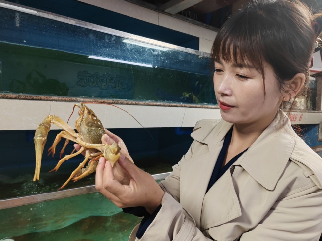 新疆额河螯虾专营店合伙人时子卜和马磊也在一旁忙着招呼几位进店的市民。市民林雅洁围着头一次见的“新鲜”转了几圈,决定买回家几只尝尝鲜,她小心翼翼地抓起一只窄螯螯虾的后背拎起来,嘴里直呼“这么大个儿”。