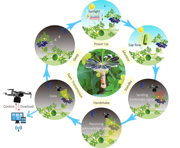 自2021年起,研究团队经过三年潜心研究,攻克了为现有农业传感器提供稳定电源的难题,提出一种仿生植物可穿戴传感器——利用太阳能实现完全的能量自给自足,长期持续监测植物体内茎流(植物健康的关键指标)。