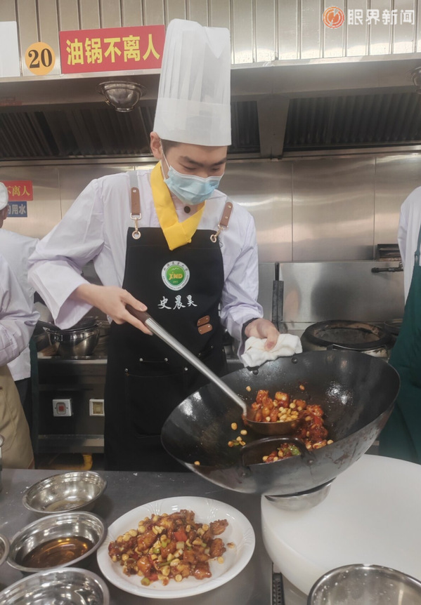 史晨昊准备将鸡肉下锅时,李继明赶忙提醒:“先把锅烧热,再倒油,这样鸡肉就不会粘锅。”说着,指导老师手持锅铲,娴熟地示范颠锅动作,“颠锅既能让食材受热更均匀,又能展现厨师的功底,大家留意手法和力度……”