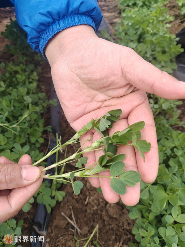 记者凑近观察,苜蓿叶片小巧而精致,绿色叶片上挂着刚才落雨留下的晶莹水珠,每一片叶子都饱含着春的生机。
