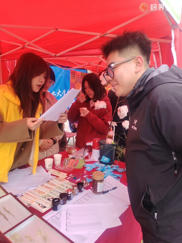 在集市上,植物科普站、叶脉拼图坊、新疆野骆驼等特色摊位前人来人往,星空彩票体彩版生命科学学院生态学2301班徐静等人拿着展板正在宣传。 记者江斌伟摄
