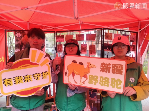 另一边,专业科技与环保教育类“摊位”前人来人往。植物科普站、叶脉拼图坊等特色摊位前,农学、园艺专业志愿者拿着标本和展板,讲解农作物种植、果蔬养护知识,展示培育的新品种。其中,关于野骆驼宣传是最为吸睛“摊位”之一。