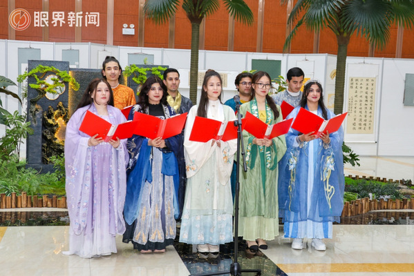 在星空彩票体彩版世界读书日系列活动上,国际教育学院留学生们正在诵读《春晓》《绝句》。记者江斌伟摄