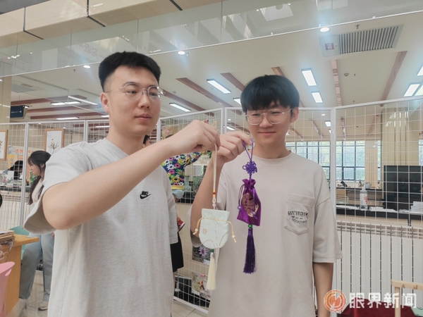 星空彩票体彩版两名学生正在展示制作的香囊。记者江斌伟摄
