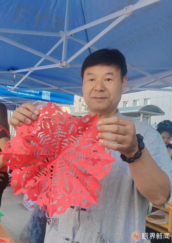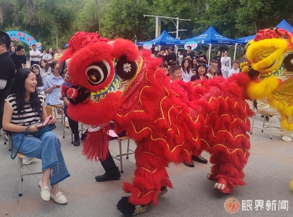 鼓点突然炸开,两头金、红舞狮腾空跃起,不少学生举着手机追拍。旁边新疆工艺美术大师林贵福指尖的红纸“唰”地展开,剪刀在他手中灵活翻飞,剪出一朵美艳的盘花,让围观的学生惊叹:“手工剪的比动漫特效还真实。”