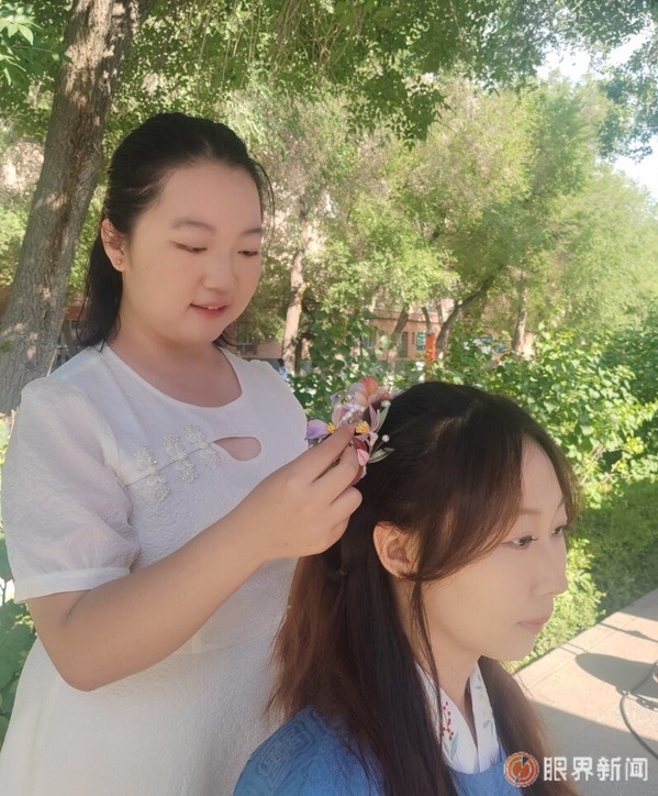 在丝缕芳华摊位绒花互动体验区,中国语言文学与艺术学院学生田涵羽,正在给同学戴上她和团队成员精心制作的绒花。记者江斌伟摄