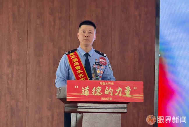 乌鲁木齐市助人为乐道德模范朱中华正在宣讲。记者王煜摄
