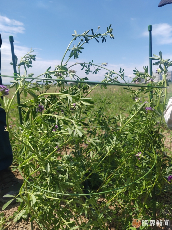 二十余片羽状复叶上挂着晨露,茎秆顶端的蝶形小花正吐露芬芳。王玉祥说:“这是我们团队历经20余载育成的品种,初花期干草中蛋白质含量高达23%,年干草产量高达1.5吨/亩,牛羊吃了上膘快。你看它根系深扎地下,今年高温天气里依然挺立。”