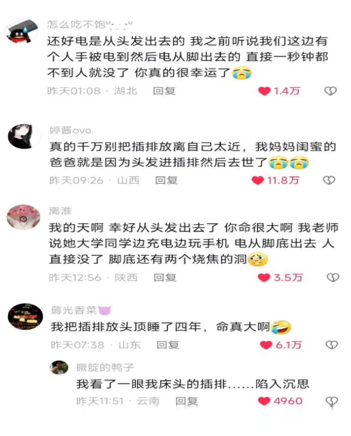 近日有人发帖分享自己在熟睡过程中被排插电击以致疯狂掉发的经历。