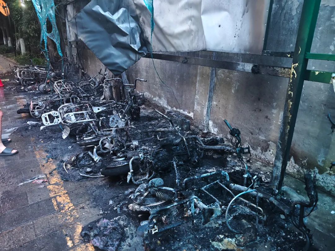 从起火到火灭的约25分钟内,车棚里停放的16辆电动车,有12辆被引燃、烧毁,数量占比达75%,直接经济损失达3.7万余元。经调查,起火原因系其中一辆电动自行车充电过程中蓄电池故障,引发火灾。