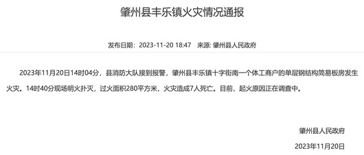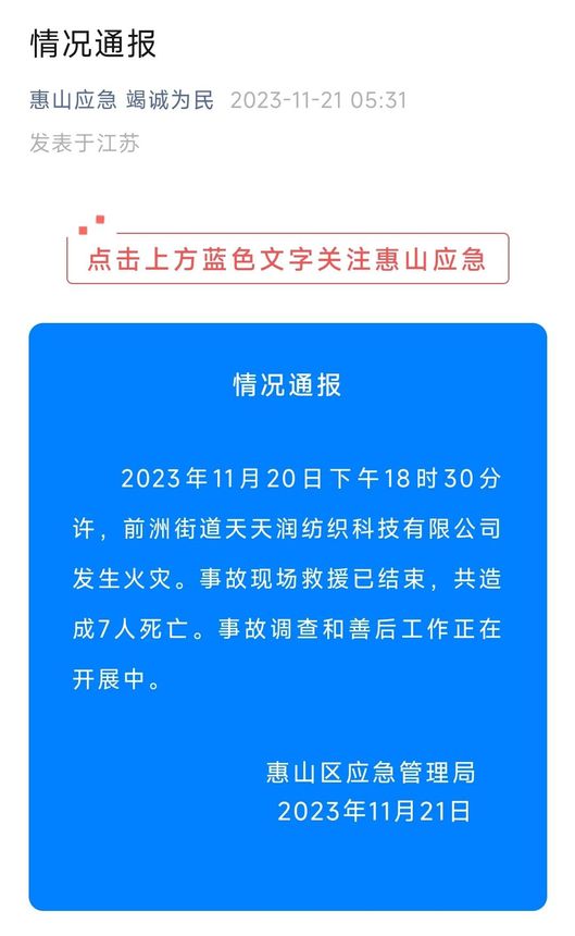 据无锡市惠山区应急管理局官微消息,2023年11月20日下午18时30分许,前洲街道天天润纺织科技有限公司发生火灾。事故现场救援已结束,共造成7人死亡。事故调查和善后工作正在开展中。