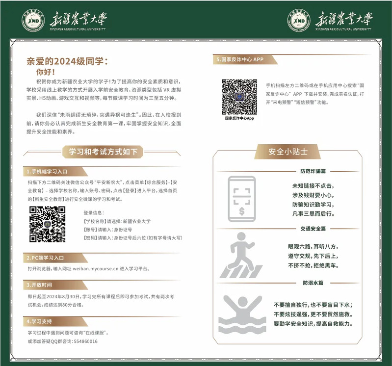 保卫处采取“多渠道发动、多方位联动”的方式,充分利用新媒体平台和四级反诈宣传微信群等平台及时发布最新反诈防诈安全宣传教育。9月4日至5日,保卫处联合农大派出所和兵团十二师兴坪派出所在新生报到现场开展“迎新生·预防电信诈骗”宣传活动,通过展板、宣传手册、宣传手提袋和互动问答等方式,向新生及家长普及常见的诈骗手段、识别技巧和防范措施,多形式、多角度、全方位、全覆盖加大反诈宣传和防范力度,实现线上线下联动,切实夯实学生安全工作基础。
