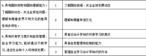本专业结合当前国内外会计学专业教育方面的最新理念,对学生进行会计业务核算与管理能力的培养,熟悉国内外财务管理领域的惯例与规则。使学生具有较强的分析和解决与会计主管及从业相适应的知识、技能和能力,使学生具备高级英语交际能力,熟练掌握计算机办公软件应用。