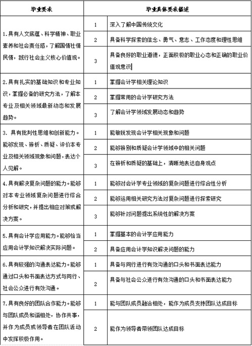 2、具有扎实的基础知识和专业知识:掌握必备的研究方法,了解本专业及相关领域最新动态和发展趋势。掌握会计学相关理论知识,掌握常用的会计学研究方法,了解会计学领域发展动态和趋势。