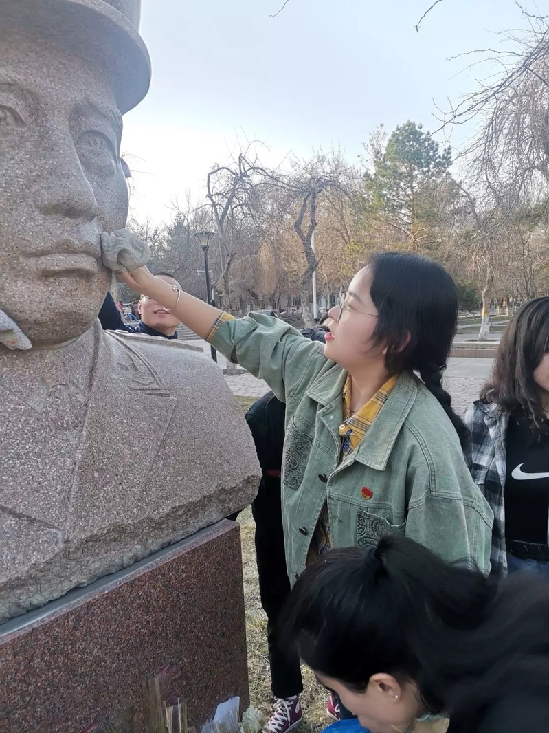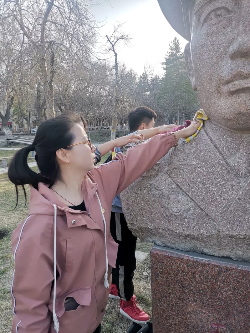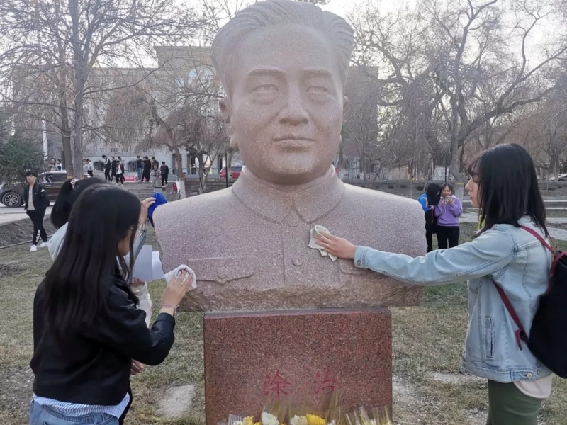 随后,一行人将王震将军和涂治院长的雕像用抹布进行擦拭并将周围的垃圾捡拾干净。