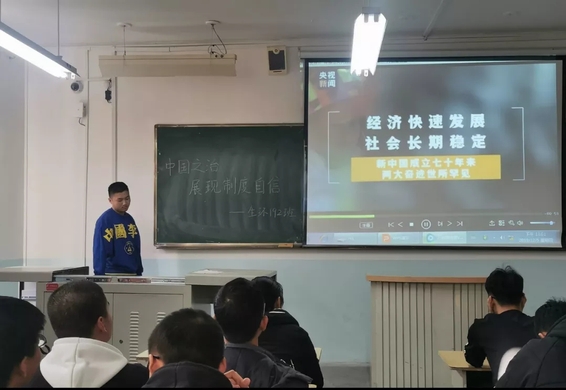 为了让同学们对党的十九届四中全会概况、“两大奇迹”证明中国特色社会主义制度优势和中国特色社会主义“四个自信”有更加深入的了解,活动播放了许多有关视频,有效引导同学们学习什么是中国制度的独特优势,什么叫做“中国之治”。