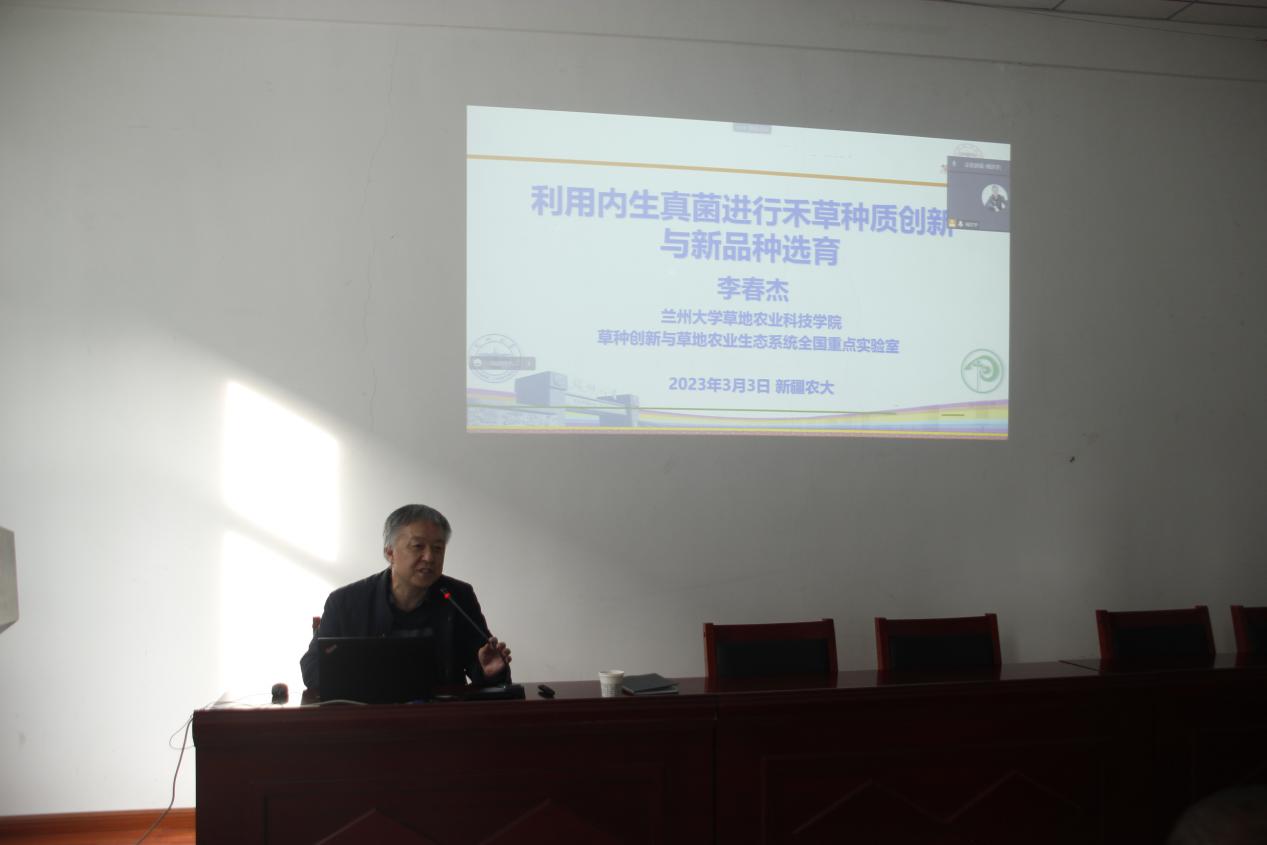 2023年3月3日上午,兰州大学草地农业科技学院院长李春杰教授来我院交流座谈,并为我院师生做了一场题为“利用内生真菌进行禾草种质创新与新品种育种”的学术报告。