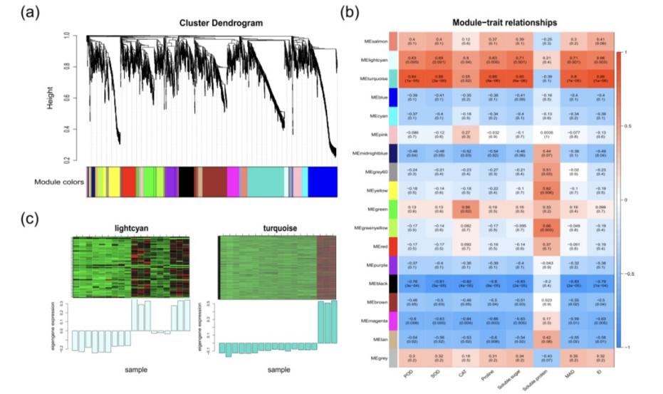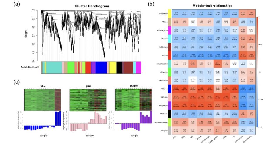 颜色标记的共表达模块(灰色模块除外)。(b) 15个模块与10个生理性状的相关分析。(c)热图显示了特征基因在蓝色、粉色和紫