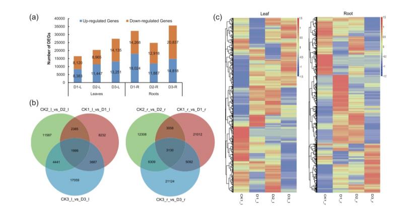 图2不同干旱处理下伊犁绢蒿的转录变化。(a) DEGs的数量。(b)维恩图显示了三种干旱处理在叶片和根系中的重叠DEGs。(c)叶和根