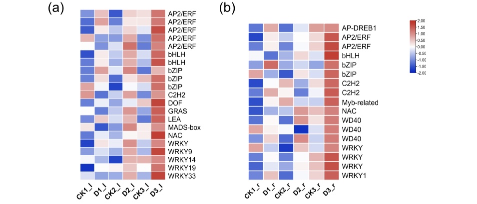 图5与抗旱性显著相关的差异表达TFs热图。(a)叶片中21个响应TFs。(b)根系中17个反应性TFs。