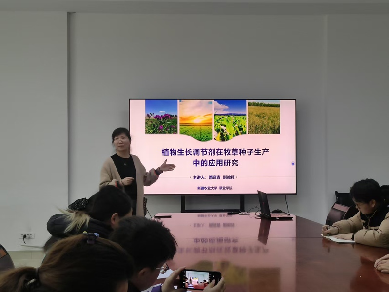 报告中,隋晓青副教授通过对比实验数据展示了调节剂施用浓度、时期与方法的优化方案。例如,在干旱胁迫条件下,低浓度赤霉素处理可提升使紫花苜蓿种子产量,同时显著增强幼苗耐旱性。她还特别指出,调节剂与田间管理技术的协同应用是未来研究的重点方向,并呼吁行业关注调节剂生态安全性评估,以实现“高产高效与绿色环保”的双重目标。与会师生对报告内容表现出浓厚兴趣,现场提问涉及调节剂在盐碱地牧草种植中的潜在应用、商业化生产的经济效益分析等,隋晓青副教授逐一解答,并分享了团队在新疆本地牧草种质资源开发中的实践经验。