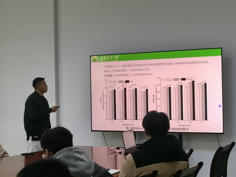 研究生吉尔尔格在题为《施氮水平下丛枝菌根真菌对无芒雀麦养分吸收及种子产量构成的影响》的报告中,展示了其团队在草-菌互作领域的最新突破。研究以新疆地区广泛种植的优质牧草无芒雀麦为对象,通过设置不同施氮梯度,结合丛枝菌根真菌接种实验,揭示了丛枝菌根真菌对植株氮磷吸收、光合效率及种子产量构成的动态影响规律。