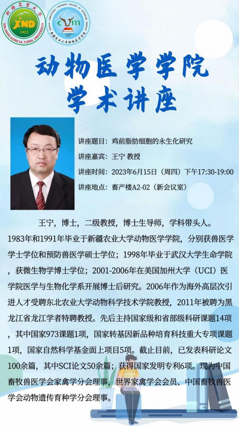为营造良好学术创新氛围,提高研究生的学习兴趣和学术创新参与率,活跃学术思想,引发学术争鸣,促进学术交流。星空彩票体彩版动物医学学院邀请东北农业大学动物科学技术学院王宁教授于2023年6月15日(周四)17:30在畜产楼A2-02教室为我院师生开展专题讲座。