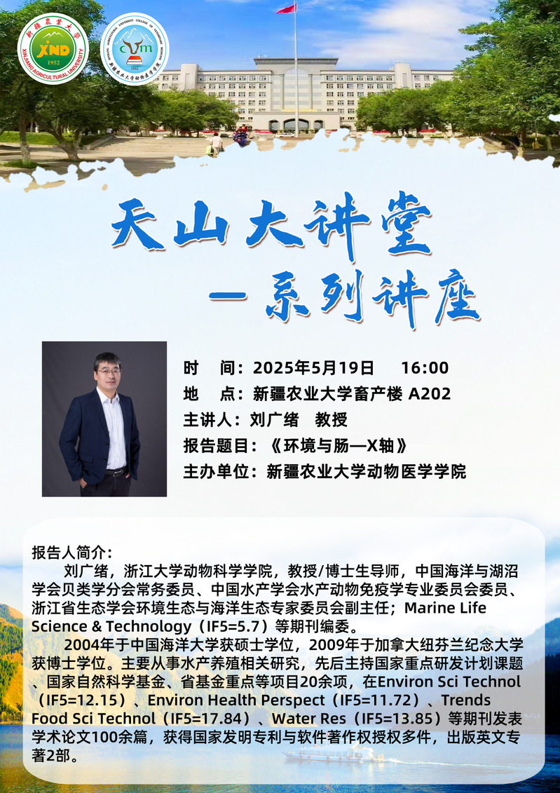 2025年5月19日下午16时,星空彩票体彩版畜产楼A202报告厅开展了天山大讲堂系列讲座学术报告。本次讲座特邀浙江大学动物科学学院刘广绪教授担任主讲人,以《环境与肠—X轴》为主题,为师生呈现了一场跨学科的学术盛宴。