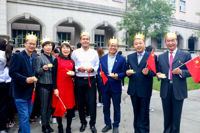 生吾炎黄,育我华夏。国庆当天,学校邀请了18名10月1日出生的师生代表,与祖国母亲共庆生日。精致的蛋糕上“庆祝中华人民共和国成立70周年”红字格外耀眼。谢树青书记,姚发业教授,单美华同学,高溪语同学共同切蛋糕,大家共同过了一个难忘而有意义的生日。