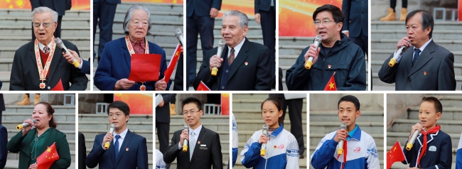 国旗下,11位不同年龄阶段的农大人深情告白祖国,演绎了一场表白爱国之情的接力赛,将全场爱国之情推向高潮。当98岁高龄的姚发业教授激情高亢地喊出“愿祖国母亲明天更美好!”祝福语时,全场响起经久不息的掌声,全体师生齐声高喊“立德树人,振兴中华!祝福祖国,繁荣富强!”