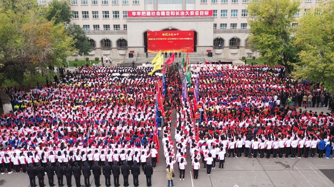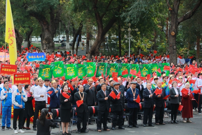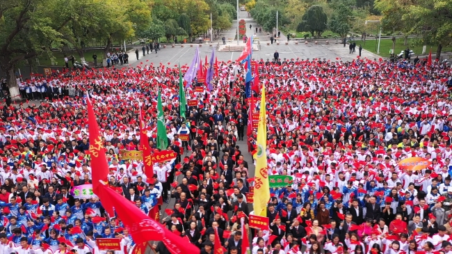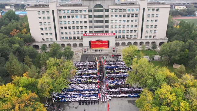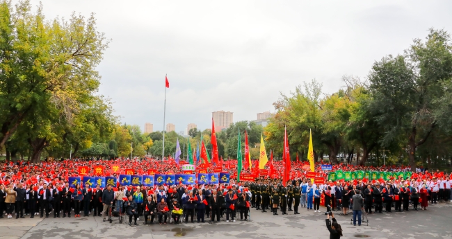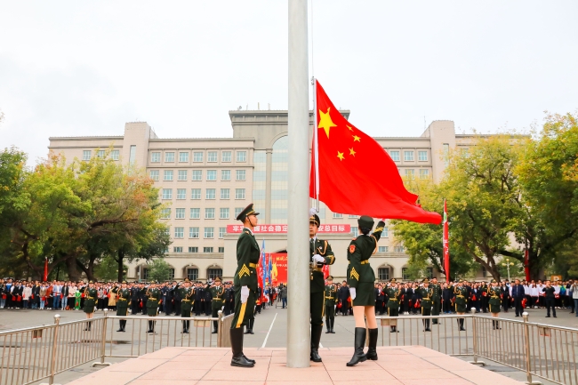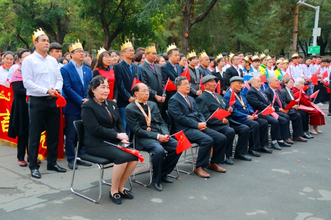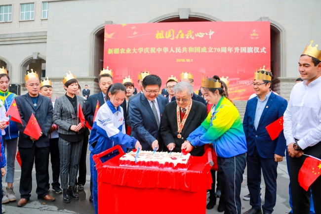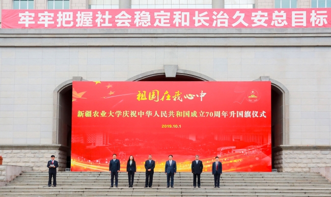 “庆祝中华人民共和国成立70周年”纪念章获得者代表,自治区主题教育第16巡回指导组成员阿尔腾·阿哈什,全体在校校领导,离退休校领导,全校教职员工、学生代表参加了学校“祖国在我心中”庆祝中华人民共和国成立70周年系列活动。