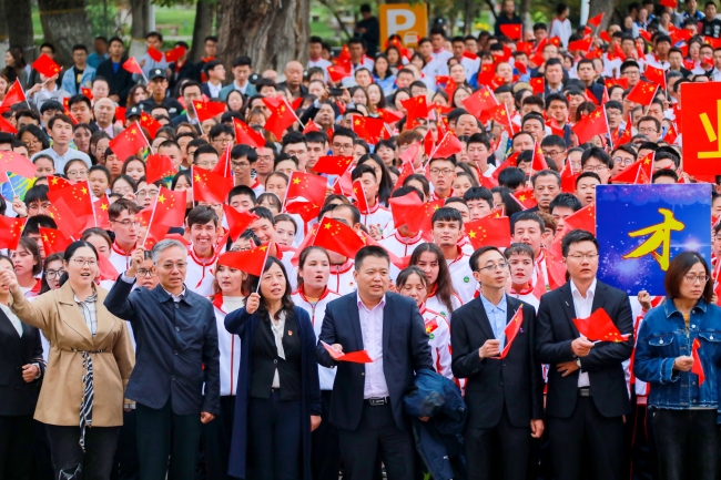 “五星红旗迎风飘扬,胜利歌声多么响亮,歌唱我们亲爱的祖国,从今走向繁荣富强……”师生们挥动着手中的国旗,饱含深情地齐唱《歌唱祖国》,现场顿时成了一片红色的海洋,师生热血沸腾,很多人情不自禁流下了热泪。