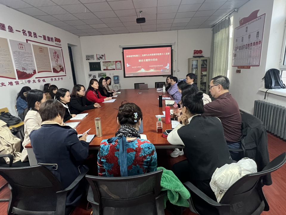 为促进党支部之间的党建和教学工作的互相学习、借鉴及提高,2023年11月8日下午,外国语学院教工第二党支部特邀我院教工第三党支部开展了一场主题为“向标杆支部学习,以党建促进专业团队建设”的联合主题党日活动。