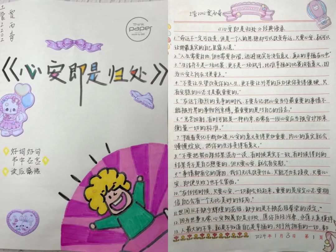 为鼓励学生在假期期间养成良好的阅读习惯,激发学生们的阅读兴趣,进一步营造“多读书,读好书,善读书”的良好氛围,更好地推动“书香校园”工作的开展。我院举办的“笔”墨书林厚“记”薄发之读书笔记绘写大赛于2月18日圆满结束。书本之上,我们感受知识的脉搏;笔尖之下,我们贯穿思维的经络;写下的每一笔都在诉说知识和思维的奇遇;故事记下的每一句都是他们畅游学海的旅途痕迹。让我们一起来欣赏同学们的优秀笔记吧!