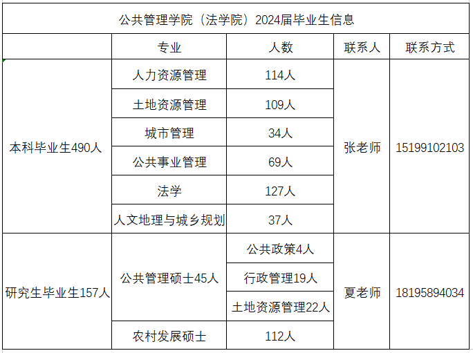 2024年拥有土地资源管理、人力资源管理、公共事业管理、人文地理与城乡规划、法学、城市管理等六个本科专业毕业生,总计490人。研究生分有两个方向公共管理方向、农村发展方向,毕业生总计157人。
