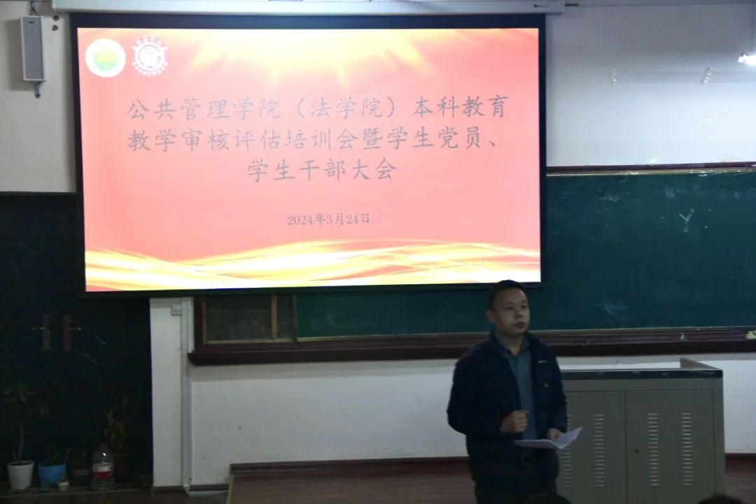 为顺利推进本科教育教学审核评估工作,进一步加强同学们对审核评估工作重要性的认识,提升对评估知识的理解和掌握,全面了解学院基本情况,切实做好评估工作,增强三全育人的理念,保证各项工作的有序开展,3月24日下午,我院在三号楼10115教室组织开展了公共管理学院(法学院)本科教育教学审核评估培训会暨学生党员、学生干部大会。