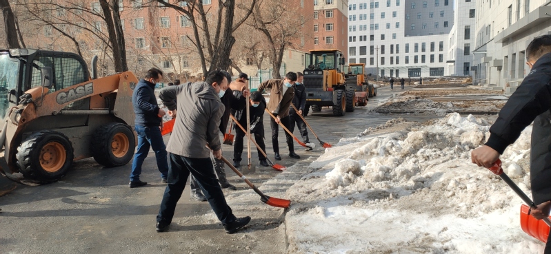 会议最后一项以“我为群众办实事”为主题开展实践活动,全体参会人员来到新建学生宿舍楼、学生公寓楼前,将通往宿舍的道路路面冰雪及周边环境进行了彻底清理,为新学期学生返校入住创造了便利条件。