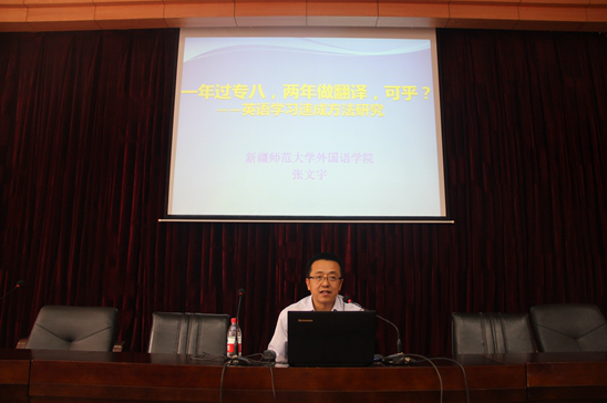 5月30日下午,新疆师范大学外国语学院副教授张文宇博士来我校为外国语学院学生作了题为《英语学习效率、方法、速成的研究》的讲座。并就英语学习策略、效率等问题与英语专业的同学们进行了热烈地讨论。外语学院11级,12级四个班级的学生聆听了此次讲座。讲座由外语学院副院长马琴主持。