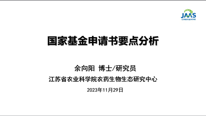 余向阳研究员围绕基金简介、基金选题、申请书写作要点,对基金的资助体系、特点、总体情况、评审时间节点,基金选题的基本要求、选题来源、创新路径、可行性、科学问题、农业科学与基金的结合点,申请书写作要点的总体要求、名称、摘要、立项依据、研究目标、内容、技术路线、方法、创新点、工作基础、写作细节等方面进行了详细的讲授,并运用大量的实践案例进行讲解,提出了行之有效的申请书写作建议。