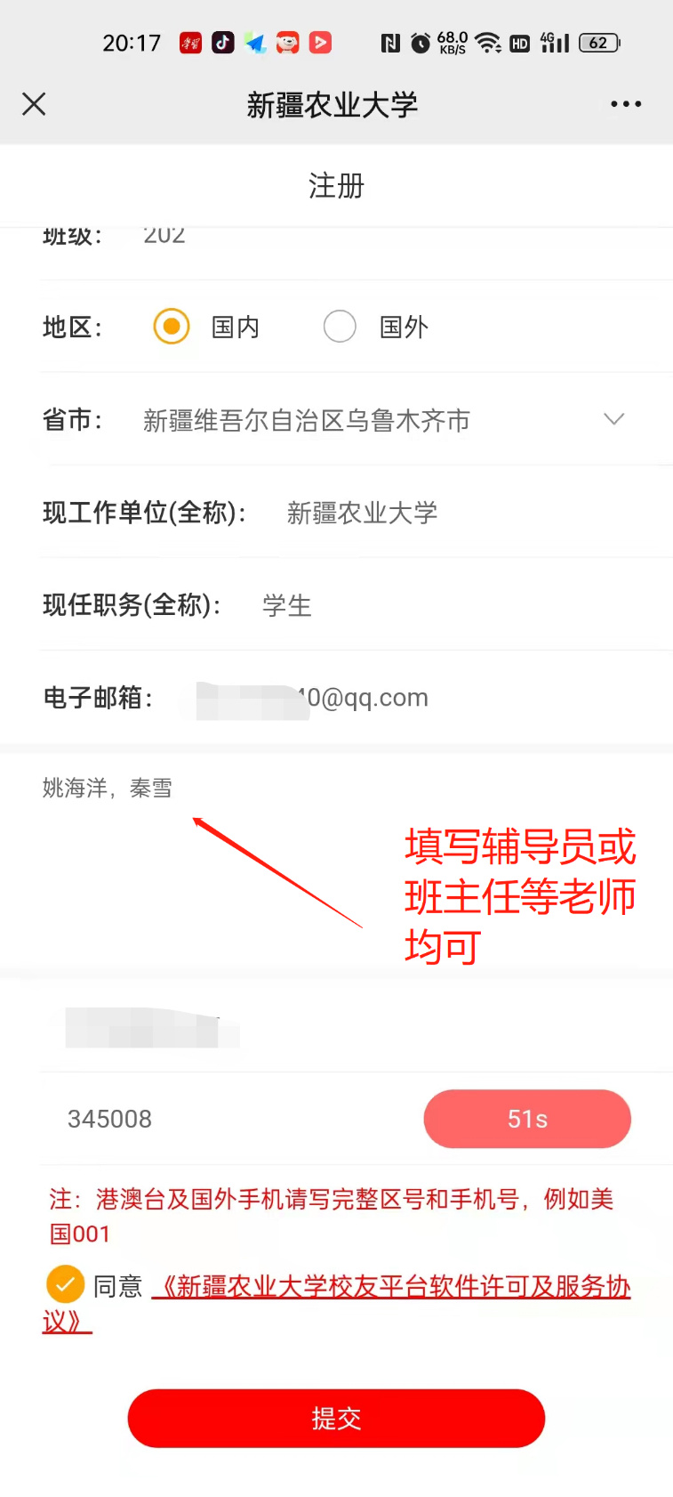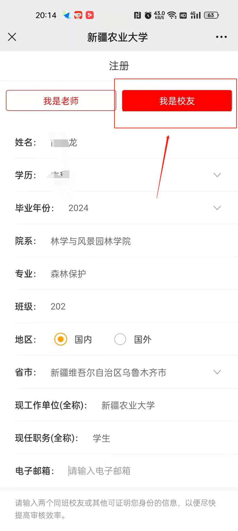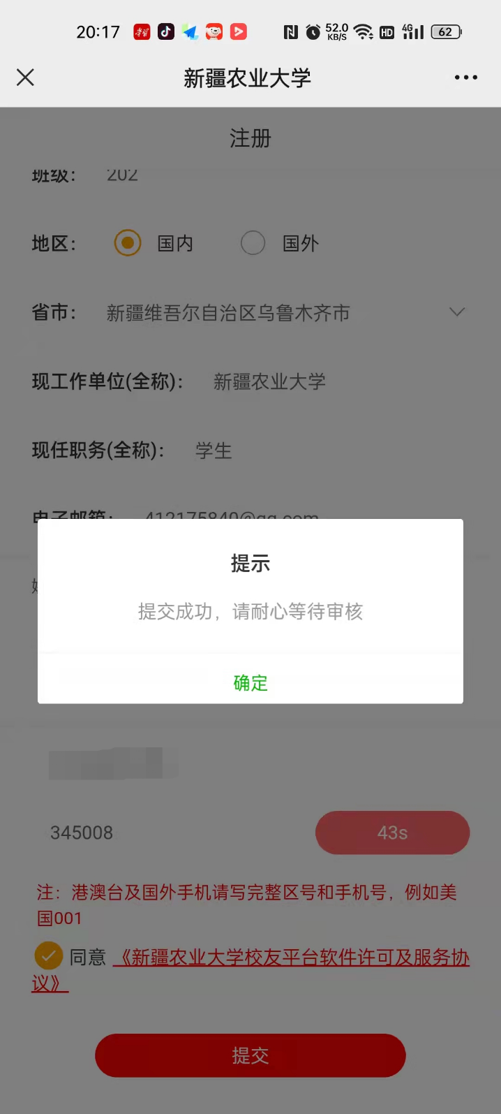 8.将个人信息填写好后,点击“提交”,等待管理员同意,即可加入林学与风景园林学院校友分会。